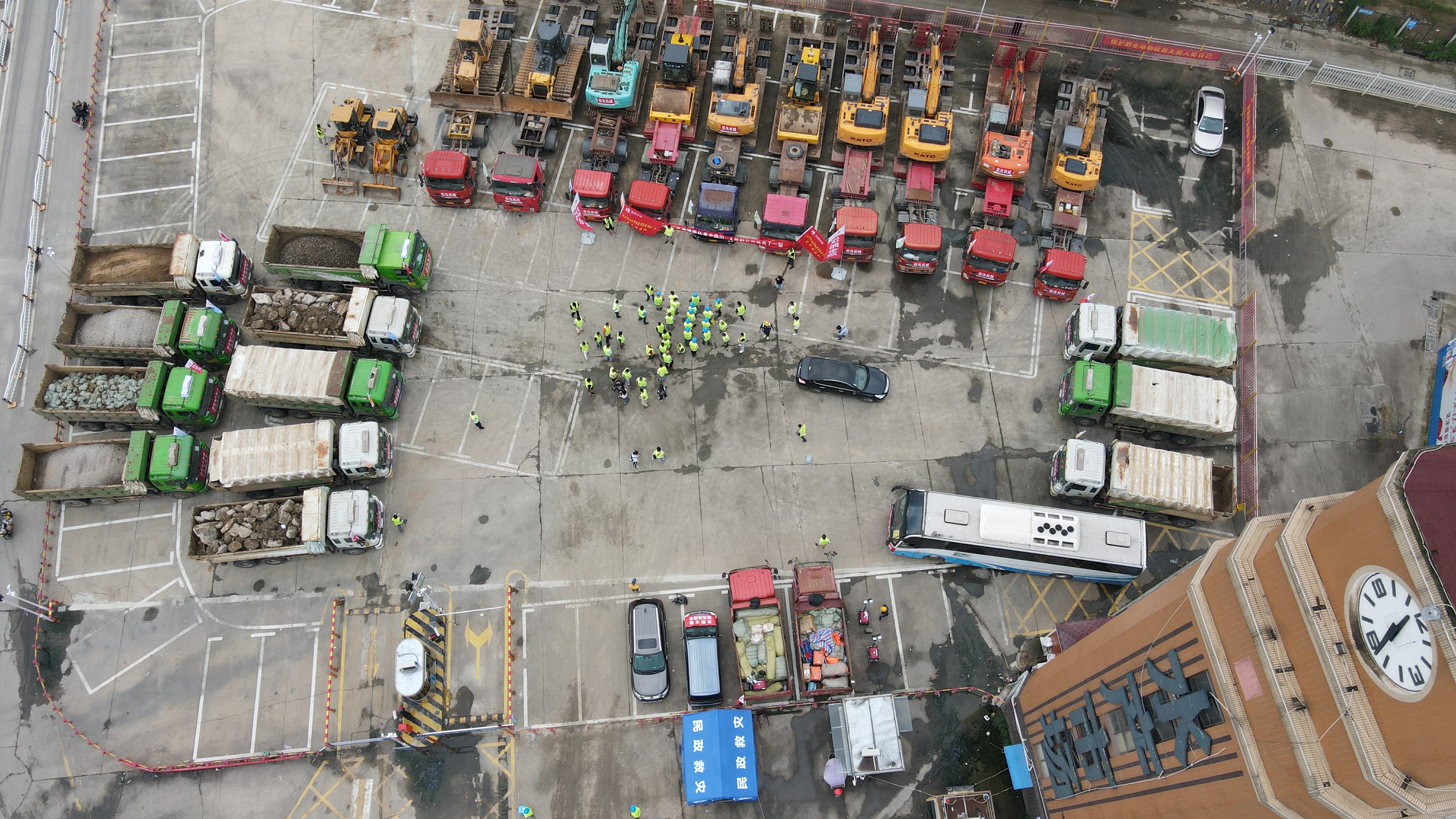 ? ? ? 作為本支突擊隊的主力軍,和諧大道項目經(jīng)理黃平和安全主管郭康接到通知后,立即著手開始準備工作。人員不足,一、二、四項目部全力支援;機械、材料不夠,全公司范圍內(nèi)緊急調(diào)度。短短半個小時內(nèi),6臺大挖機、12臺后八輪自卸車、10臺平板車、2臺壓路機、2臺農(nóng)用車、2臺鏟車、2臺推土機全部調(diào)度到位,2000件編織袋、24方黏土、12車小石、12方粗石、36方石渣料、24方大石塊、20捆彩條布、20捆土工布、20把鐵鍬已裝車待發(fā)。