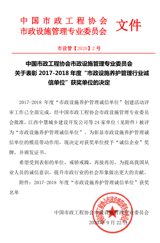 近日,經過中國市政工程協會市政設施管理專業委員會評選,漢陽市政首次榮獲2017-2018年度“市政設施養護管理誠信單位”,彰顯了公司在市政管養領域的模范帶頭作用。
