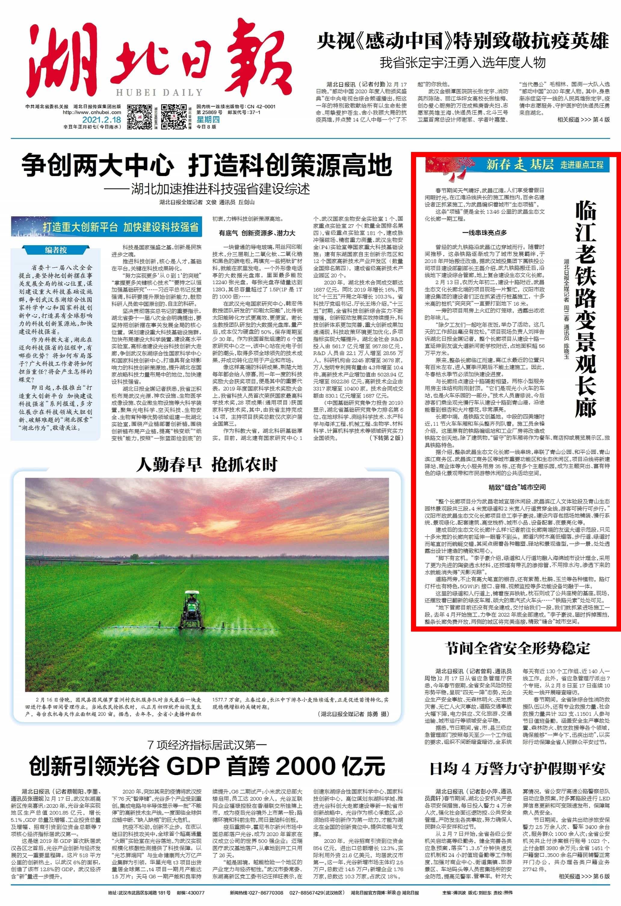? ? ? 2月18日,大年初七,新年后上班的第一個工作日,湖北日報頭版報道漢陽市政在建項目——武昌生態(tài)文化長廊施工進展和工程亮點,點贊漢陽市政建設(shè)者們利用春節(jié)假期搶抓工期,為武昌編織城市“生態(tài)項鏈”。