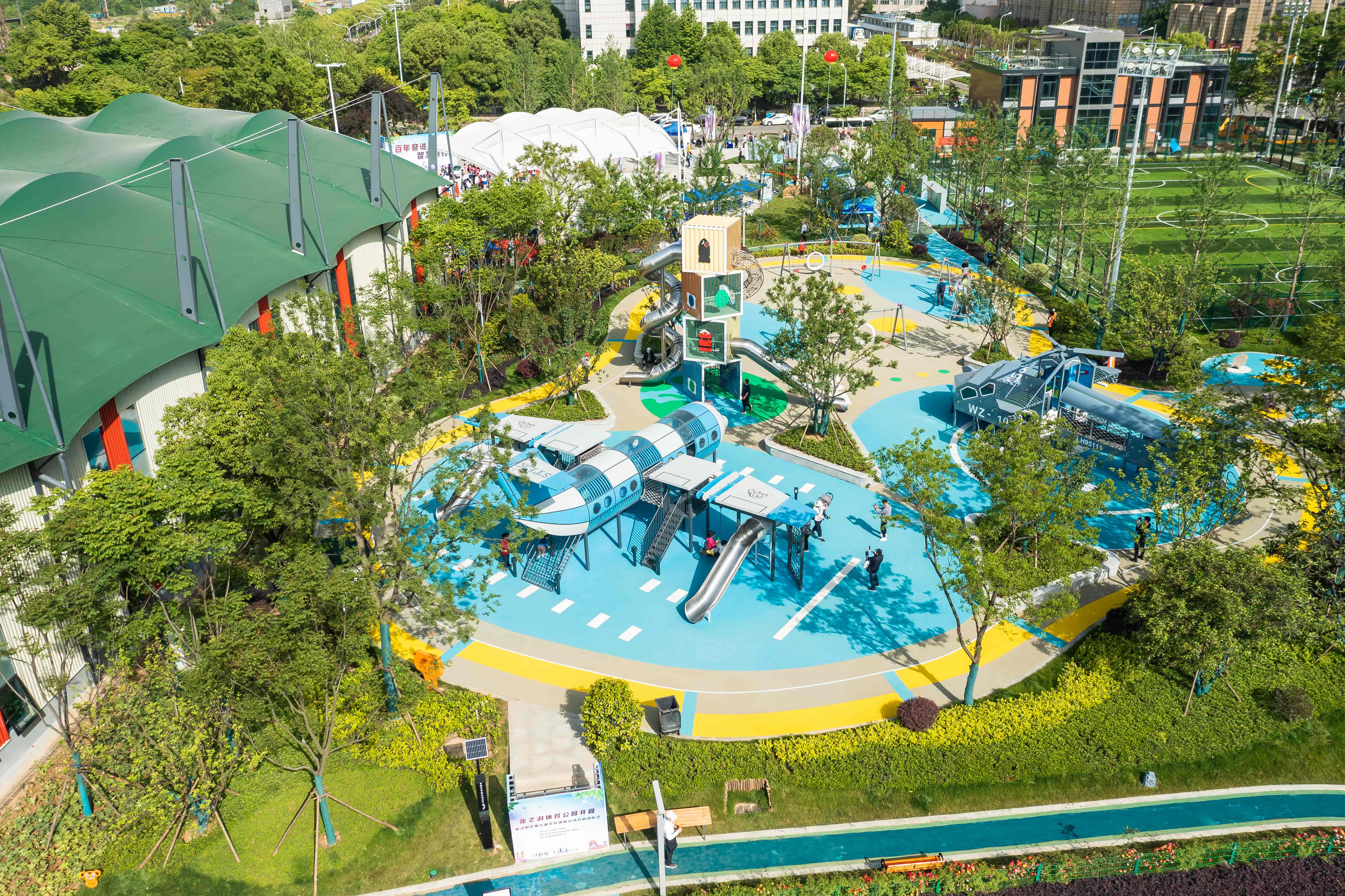 在公園的中間地帶,是兒童和青少年活動區(qū)。這里有直升機、運輸機等形狀的游樂設(shè)施,還有各色的卡通動畫秋千及座椅,既融入了軍事元素體現(xiàn)張之洞文化,又富有童心,展現(xiàn)了青春與活力。