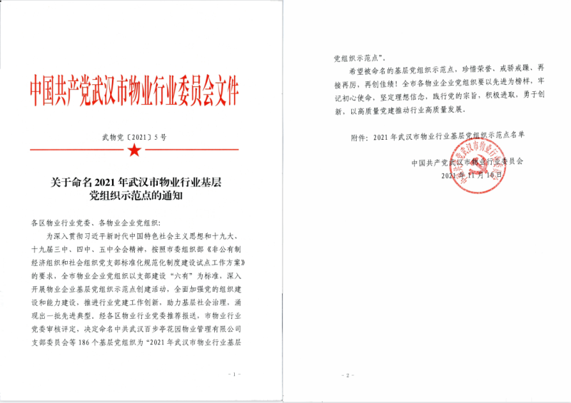 近日,中共武漢市物業(yè)行業(yè)委員會公布《2021年武漢市物業(yè)行業(yè)基層黨組織示范點名單》,漢陽市政安居興業(yè)公司黨支部名列其中。經(jīng)各區(qū)物業(yè)行業(yè)黨委推薦報送,武漢市物業(yè)行業(yè)黨委審核評定,全市共有186個基層黨組織被命名為“2021年武漢市物業(yè)行業(yè)基層黨組織示范點”。