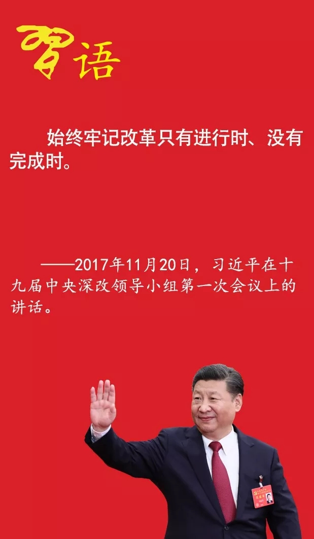 ——這是習近平總書記在十九屆中央深改領導小組第一次會議上的講話。此前,“改革只有進行時、沒有完成時”的論述已廣為人知,但此次加上“始終牢記”4個字,進一步彰顯出黨的十九大繼續推進全面深化改革的堅定決心。