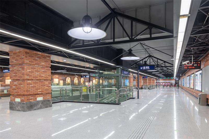 紅鋼城站以“紅城歲月”為主題,從紅鋼城的原始風貌入手,車站立柱提取“紅房子”紅磚元素,采用仿紅磚質感的高強纖維板進行仿制,墻面還原老建筑形態,上下采用紅色仿制磚,中間區域采用灰色的高強纖維水泥板,以打造懷舊的老武漢歲月感。車站照明燈具設計結合了極富工業元素的工礦燈,旨在將地鐵空間融入周邊環境,凸顯老武漢的街景特色。