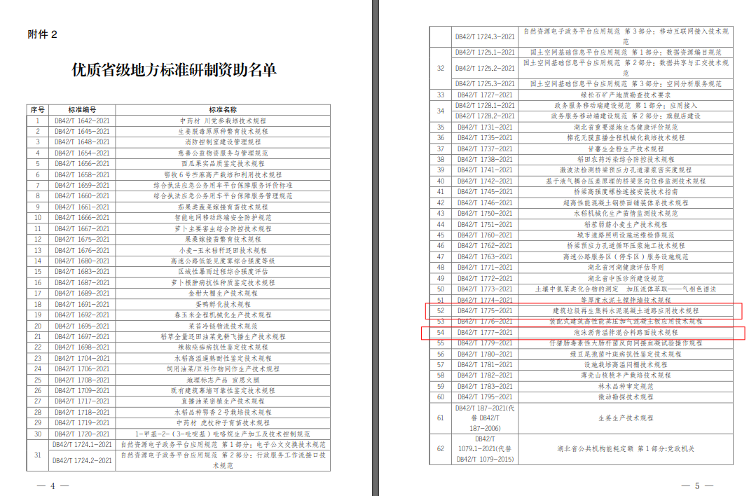 漢陽市政入選此次優質省地標為(《建筑垃圾再生集料水泥混凝土道路應用技術規程》DB42/T 1775-2021、《泡沫瀝青溫拌混合料路面技術規程》DB42/T 1777-2021),主要涉及混凝土和瀝青材料的推廣應用,標志著公司在垃圾資源化利用和泡沫瀝青的應用推廣等方面得到行業認可,達到省內領先水平,具有較高的推廣應用價值,為將來在道路工程的新材料與綠色技術的研發和推廣提供有力支撐。