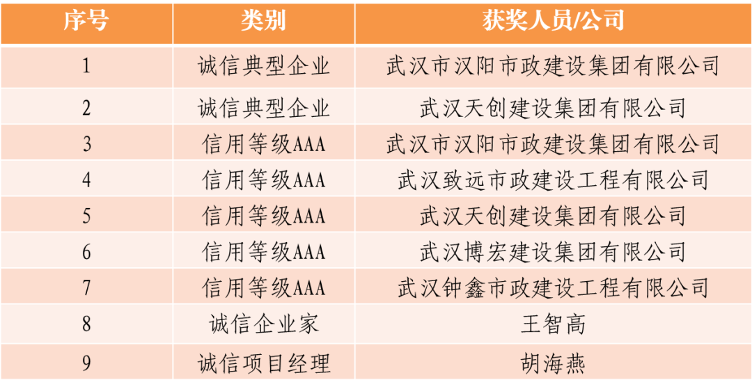 近日,中施企協發布關于信用等級評定和誠信企業、誠信企業家等評定的公示,漢陽市政及漢陽市政致遠建設、天創建設、博宏建設、鐘鑫建設保留“AAA誠信企業”榮譽稱號,漢陽市政及天創建設獲評典型誠信企業,漢陽市政總經理王智高獲評誠信企業家,漢陽市政胡海燕獲評誠信項目經理。